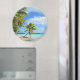 Round souvenir photo magnet with a hanging palm tree on a white sand beach of a tropical island in the Pacific Ocean belonging to the Tahiti archipelago French Polynesia.