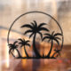 Vector illustration of a tropical sunset and palm trees on a small vacation island paradise. Keywords: beach, caribbean, cartoon, illustration, island, isle, palm, palmtree, paradise, sea, season, silhouette, summer, sun, sunrise, sunset, tree, tropic, tropical, vacation, vector, palms