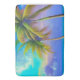 The design features two striking palm trees in the front right that create a sense of depth and perspective, while the sky above is a mix of varying shades of blue with white and blue clouds and other colours like yellow and purple pleading in. The ocean and sand at the bottom of the mat give the overall design a perfect touch of detail.