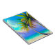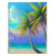 Introducing our stunning spiral notebook with a breathtaking design of palm trees against a sky with varying shades of blue, white and blue clouds, and other colours like yellow and purple. This notebook depicts a beautiful beach or tropical scene with a bit of sand and the ocean, making it perfect for all your writing needs, whether it's journalling, taking notes, or writing stories.