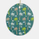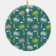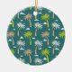 A mid century, retro pattern of white, green and light brown palm trees and white and blue clouds, against a darker green background.