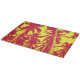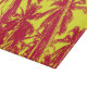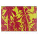 Bold decoration of palm trees in a posterised style. Red with a yellow background.