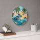 A vibrant wall clock design featuring tropical elements including palm trees, jumping dolphins, and a serene ocean sunset scene, evoking summer, nature, and marine vibes for your home decor.
