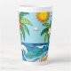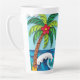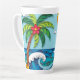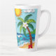 A coastal Latte Mug in a paper quilling style ai illustration of two palm trees, the sun, ocean waves, a beach and tropical flowers.