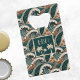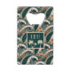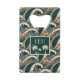 This Polynesian inspired vintage look bottle opener -- with a very handy size that's similar to a cred card -- features a pattern of palm trees and waves in green with a hint of teal, tan, brown, and creamy off-white. Your monogram initials appear in light tan against a colour block of dark green, along with palm trees. It's easy to tote around this tropical look opener so you can open your bottles whether you're at a beach, in our basement bar, or in your backyard.