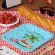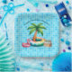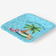 Hold an unforgettable pool party with this azure - light blue patio tile design that includes a palm tree, a cute flamingo and some cold refreshing drinks by the pool.