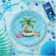 Hold an unforgettable pool party with this azure - light blue patio tile design that includes a palm tree, a cute flamingo and some cold refreshing drinks by the pool.