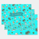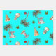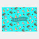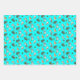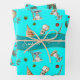 Beach Christmas wrapping paper sheets with custom greeting text. Bright, aqua blue paper with a pattern of palm trees and beach sand Christmas trees and snowmen. Each sheet has a different size pattern, and one sheet has a teal blue banner to hold your choice of greeting. The sample wording is, "Seas and Greetings", or change it to Merry Christmas, Seasons Greetings, or Happy Holidays.