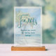 Wedding reception favour table sign. Tropical palm trees and beach scene image on opaque, acrylic sign. Customise the sea blue text as you wish. Large wording is "favours" with a short thank you message to guests, "Thanks so much for being here today". This small 8x10 inch sign has an optional wood stand (for an additional cost). Larger signs do not come with a stand option, and they will bend, so plan to attach them to something.