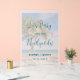 Wedding reception welcome sign with palm trees and beach scene background image. Frosted acrylic, large or small sign has wording, "Let's party with the Newlyweds" along with names of the couple and wedding date. Opaque, tropical-themed sign comes in many sizes. Text is dark sea blue colour in script and printed fonts. The largest signs will bend, so plan to attach them to an easel, or other type of stand, in some way. Smaller signs will stand on their own in a holder. A protective film will cover the design and will need to be removed before use.