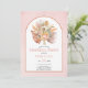 Soft pink arch wedding rehearsal dinner invitation with tropical dried palm leaves, pampas grass and protea flowers. An arch frame on a soft blush pink stained background frames this lovely wedding design. A watercolor bouquet of dried palm leaves, protea flowers, and pampas grass is displayed in the frame.