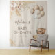 Bohemian Bear baby shower tapestry featuring a light brown background, a vintage watercolor baby bear, balloons, rustic boho pampas grass & florals, plus a modern text template that is easy to personalise.
