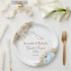 Elegant modern boho botanical pampas grass gender reveal He or She baby shower party paper plates featuring watercolor illustration of pampas grass floral with blush pink and dusty blue flowers. You can customise these beautiful plates with your own text.