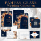 Stunning, modern wedding enclosure card featuring pampas grass boho elements in rust terracotta, rustic hues with navy blue background. Add the URL of your wedding website on the reverse of the card and the QR code will be updated, or delete if not required. Customise with your own details by using the text templates.