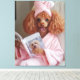A hyper-realistic image of a charming poodle relaxing in a pink bathrobe with a matching towel wrapped around its head. The adorable dog is comfortably sitting on a chair, holding a magazine featuring another poodle on the cover. Its playful expression and luxurious spa-like setting make this scene both cute and amusing.