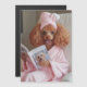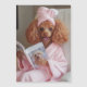 A hyper-realistic image of a charming poodle relaxing in a pink bathrobe with a matching towel wrapped around its head. The adorable dog is comfortably sitting on a chair, holding a magazine featuring another poodle on the cover. Its playful expression and luxurious spa-like setting make this scene both cute and amusing.