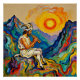 A.I. assisted print of Pan, the mythical ancient Greek god of the wild, shepherds and music half man. half goat seated on a rock, playing his pipes amidst vibrant, swirling mountain landscape under a bright sun.