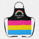 Medium-sized apron with an image of a pansexuality pride flag and a rainbow; pink, yellow, and blue design on a black background, with a customisable text template for your own name or message