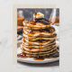 Tall stack of pancakes with dripping syrup and a pat of butter for pancake breakfast invite
