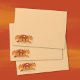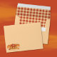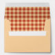 The perfect fall envelope with a watercolor illustration of some pumpkin spice pancakes on the outside left corner and a rusty brown Buffalo plaid pattern inside .