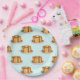A pattern of delicious pancake stacks on plates, covered in maple syrup and surrounded in polkadots. The background colour is a nice minty green! This fun and tasty pancake pattern is a great gift idea for foodies and pancake lovers alike!