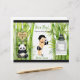 Panda & bamboo theme in black, white & green colour scheme. Baby boy in bamboo patterned diaper with panda slippers and bow tie, holding a stuffed panda bear. Perfect for baby shower or birthday.