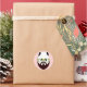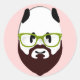 A black and white, panda bear wearing green glasses. The panda has a brown beard and moustache. The background is a pink circle. A fun, funny, humourous, hipster design.