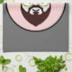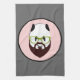A black and white, panda bear wearing green glasses. The panda has a brown beard and moustache. The background is a pink circle. A fun, funny, humourous, hipster design.