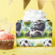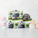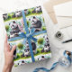 Panda bear cradling a baby panda in a lush green meadow, with bamboo gently swaying in the background.