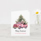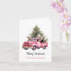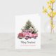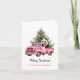 Panda in Pink Vintage Van Christmas Greeting Card. Watercolor drawing of white panda bear in a pink vintage truck and Christmas trees with pink baubles. Personalised text.