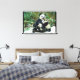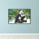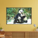 A Panda with cubs.has a black and white panda sitting with her two cubs with aforest view behind him and a trees around them and snow on the ground.this is a beautiful photo. on this Wrapped Canvas