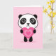 Folded greeting card featuring a cartoons illustration of a little panda holding a big heart on a pink background. Customizable text inside "I love you"