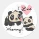 A mummy and baby panda bear design with a pink background and text and white hearts and text that reads I Love Mummy on T-shirts, bodysuits, mugs, cards, stickers, bags, magnets, and more.