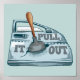 A funny illustration of a car door which has been dented in an accident. A plunger is being used to pull the deed out. The text reads pull it out. A funny design for anyone who works in a panel repair shop.
