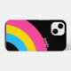 Beautiful pansexual pride iPhone 14 case gift on a bold black background for a panromantic friend featuring the pretty pan flag colours shaped into a pink, yellow, and blue rainbow. A cool custom queer phone cover present for the LGBTQ community.