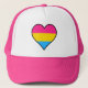Hot Pink Trucker Hat with heart design in colours of pansexuality; pink, yellow and blue stripes pride flag, rainbow love design