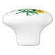 Cheerful bouquet of yellow and purple pansies on a white round ceramic cabinet or drawer knob.