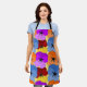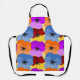 This apron has a Spring design of purple, blue, orange, and red with yellow pansies layered on each other on a field of yellow.