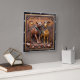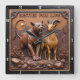 This dramatic square wall clock features a highly dimensional, close-up illustration of a brown panther (or leopard) and a white, happy goat standing side-by-side. The entire design is rendered in muted brown, tan, and dark leather-like tones, strongly suggesting a deep sculpted relief or Sculpted Leather Look. The panther has textured spots and is positioned on the left, while the goat is on the right, smiling with large horns. The background features detailed rocky terrain and stylized foliage carved behind the animals, with heavy texture throughout. The entire foreground is textured, resembling carved rocks and ground cover. The large, three-dimensional embossed text "BESTIES FOR LIFE" is carved across the top center in a bold, golden serif font. The clock face features a simple clock face border with large, white, numbered tick marks (1 to 12) integrated into the outer frame. The artwork is surrounded by a thick, dark brown decorative border that resembles a black wood frame.