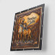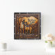This highly dimensional square wall clock features a bold, close-up illustration of a brown panther (or leopard) and a white, happy goat standing side-by-side. The entire design is rendered in muted brown, tan, and dark leather-like tones, strongly suggesting a deep sculpted relief or Sculpted Leather Look. The panther has detailed spots and is positioned on the left, while the goat is on the right, smiling with large curved horns. They are surrounded by an elaborate wreath of gnarled, dark tree roots and branches carved into the perimeter. The background is a dark leather panel with heavy texture. The large, three-dimensional embossed text "BESTIES FOR LIFE" is carved across the top center in a bold, golden serif font. The clock face features a simple clock face border with large, white, numbered tick marks (1 to 12) integrated into the outer frame. The artwork is surrounded by a thick, dark brown decorative border that resembles a black wood frame.