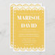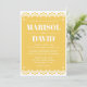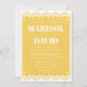 A beautiful papel picado style wedding invitation on a festive yellow background. The back features a dove design with the couple's initials. Perfect for a traditional or modern Mexican wedding.