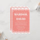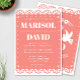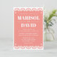 A beautiful papel picado style wedding invitation on a coral pink background. The back features a dove design with the couple's initials. Perfect for a traditional or modern Mexican wedding.