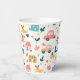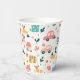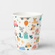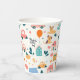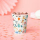 Cups with colourful patterns of cute cartoon houses, cars, plants, and other playful designs, featuring simple lines and shapes, creating an adorable children's party look. The design is simple yet charming, an adorable and delightful pattern that complements its role as a kids' birthday decoration item. This product will add fun to any celebration, providing young guests with a whimsical touch during their special day! overall clean look, detailed textures that give the feeling of cuteness and playfulness, use for kids' drinks or party decorations