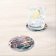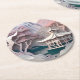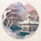 A lovely faux paper cutout landscape round paper coaster with mountains, pavilion, and trees.