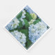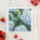 Party paper napkin shown with a photo print of pretty blue hydrangeas. Standard dinner size shown.
