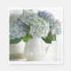 Party paper napkins shown in the white luncheon size with a photo print of pretty blue hydrangeas.