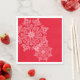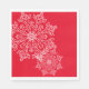 Party paper napkins shown in the white luncheon size with a festive holiday winter snowflakes print on a red background colour.