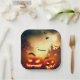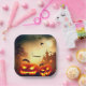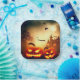 The scene is set in a dark forest with a full moon in the background. The main focus of the image is two large jack-o-lanterns with evil grins, sitting on the ground with dead leaves scattered around them. In the background, there is a haunted castle with bats flying around it. The colour scheme of the image is predominantly orange and black.