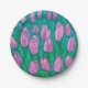 Paper Plate featuring colourful floral painting, emerald green field full of beautiful spring flowers. Pink tulips symbolise a feeling of happiness, self-confidence and positivity. This artwork fits great for Easter or Woman's day greetings, or as birthday gifts for girls and women.