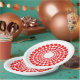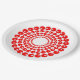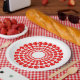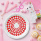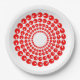 Red beads threaded on a thin line, form a circle. The circle is replicated 4 more times in increasingly smaller circles going to the centre. Placement of the "hole" in bead creates an optical illusion of a tunnel effect. Back is solid red.